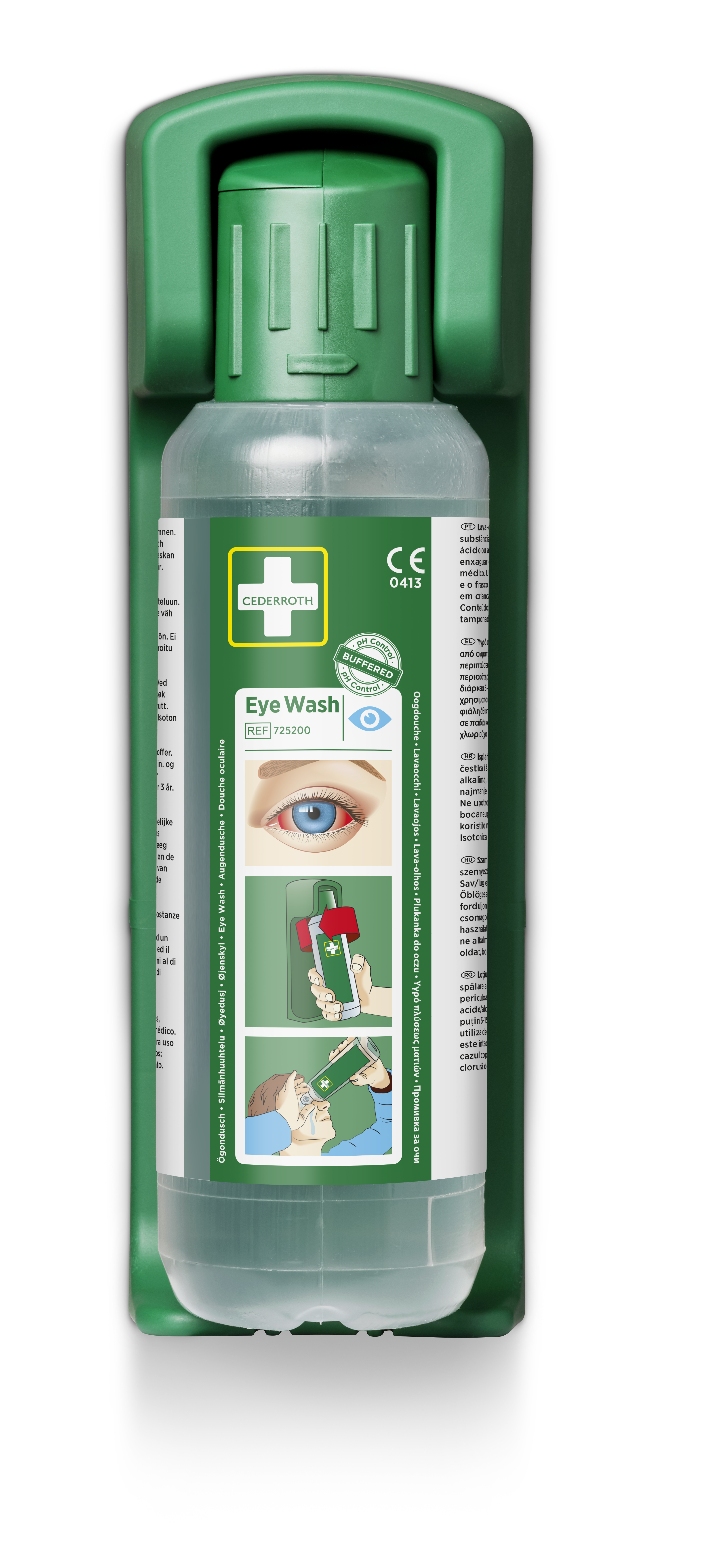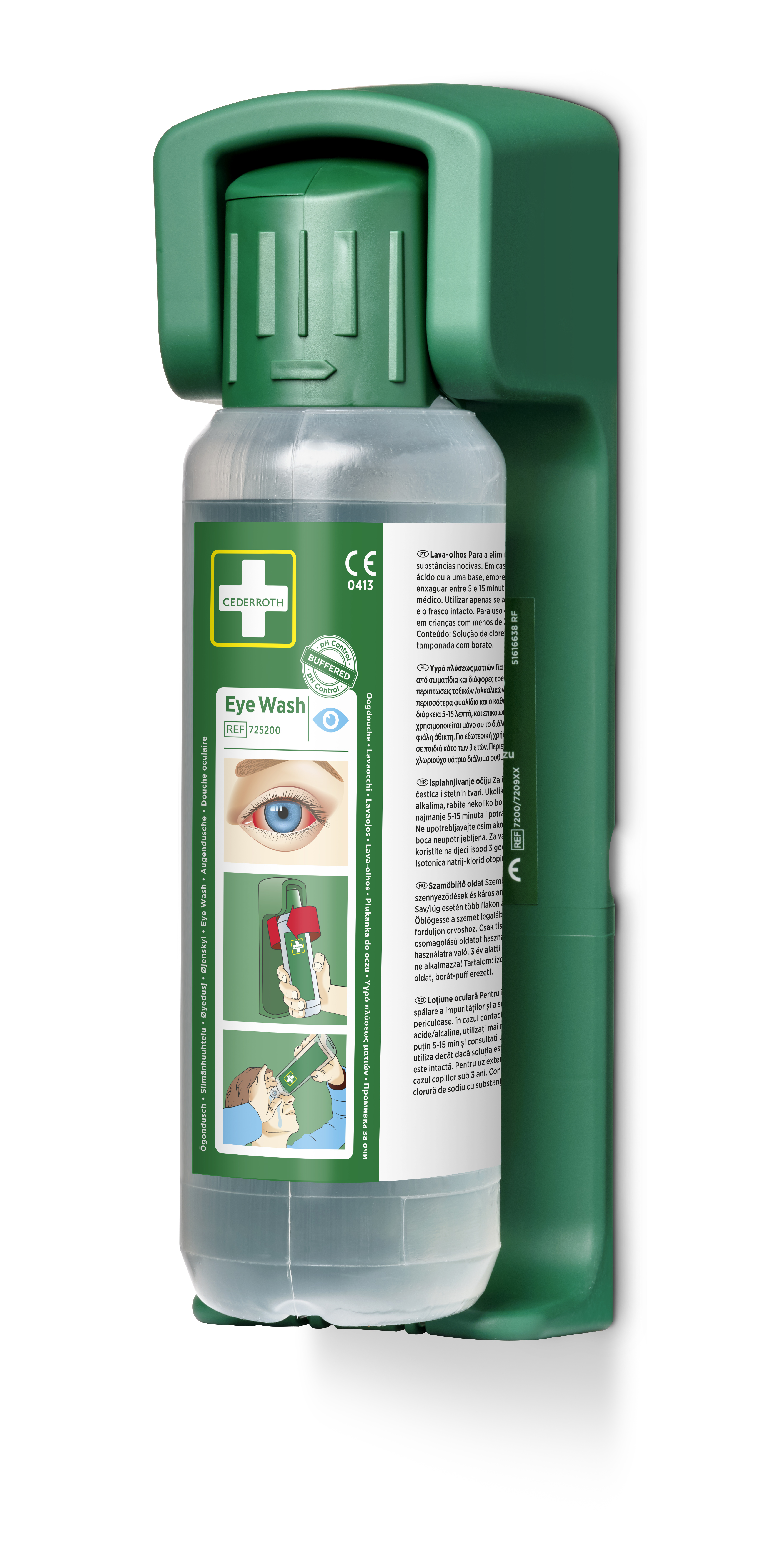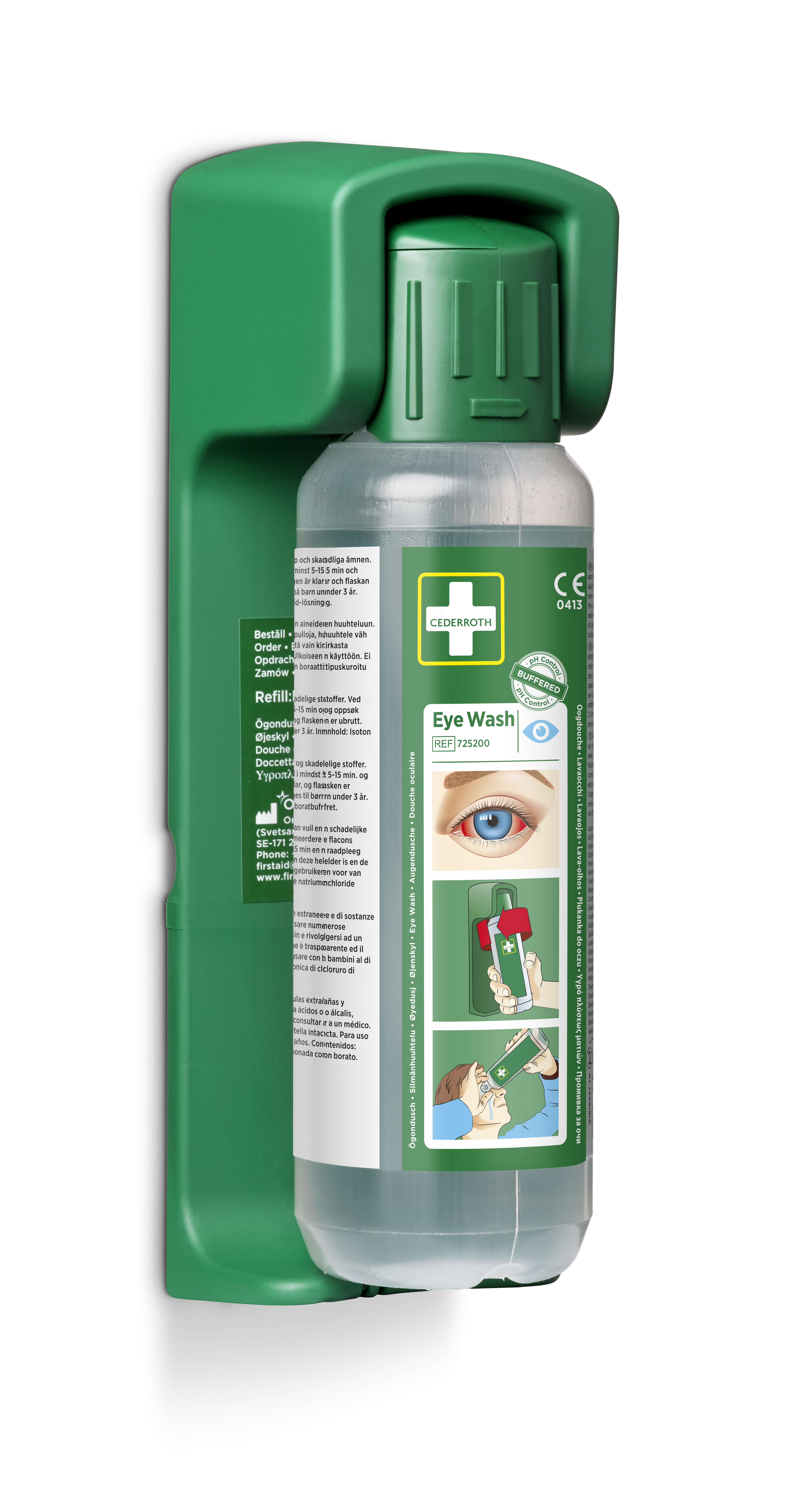 Stabile, praktische Wandhalterung für die Cederroth Augendusche 500 ml (REF 725200). Mit der Wandhalterung erhält die Flasche einen festen Platz. So wissen alle, wo die Augendusche zu finden ist. Die Flaschen sind arretiert und werden bei der Entnahme aus der Wandhalterung automatisch geöffnet. Auf diese Weise kann sofort mit der Spülung begonnen werden. Eine nachleuchtende Anleitungstafel liegt bei.
