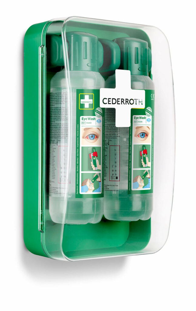 Et kompakt øjenskylleskab, der beskytter mod støv og vand. Indeholder 2 flasker Cederroth Øjenskyl. Let at finde plads til selv i mindre rum. Gennemsigtigt låg for høj synlighed. Flaskerne åbnes automatisk, når de drejes ud af holderne, og skylningen kan påbegyndes med det samme.