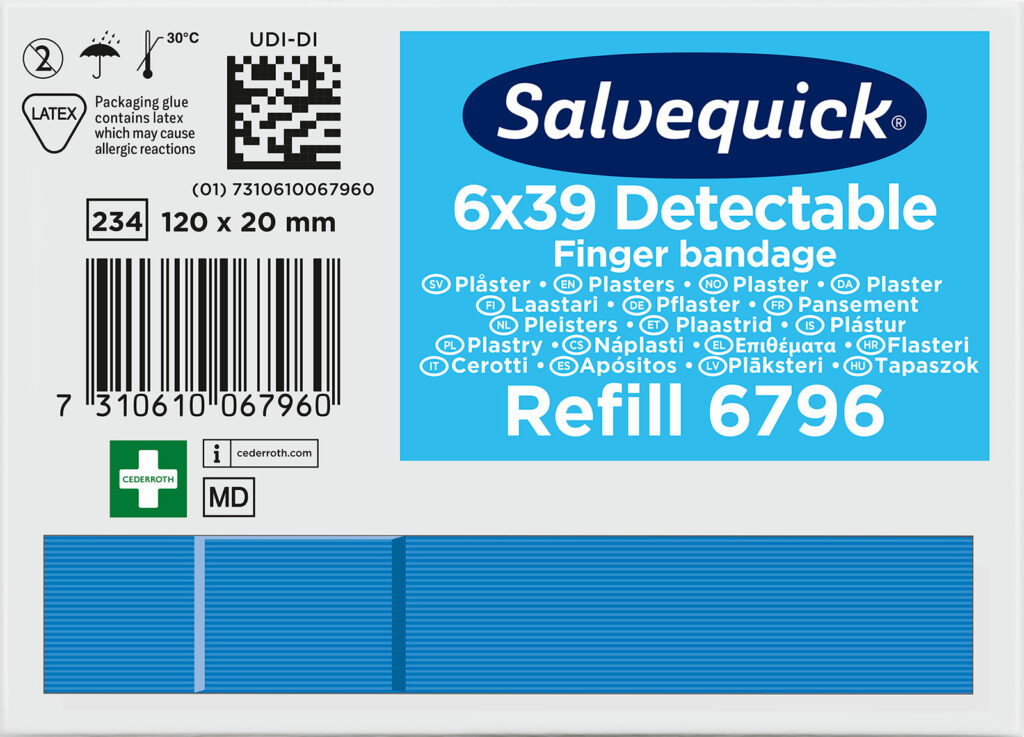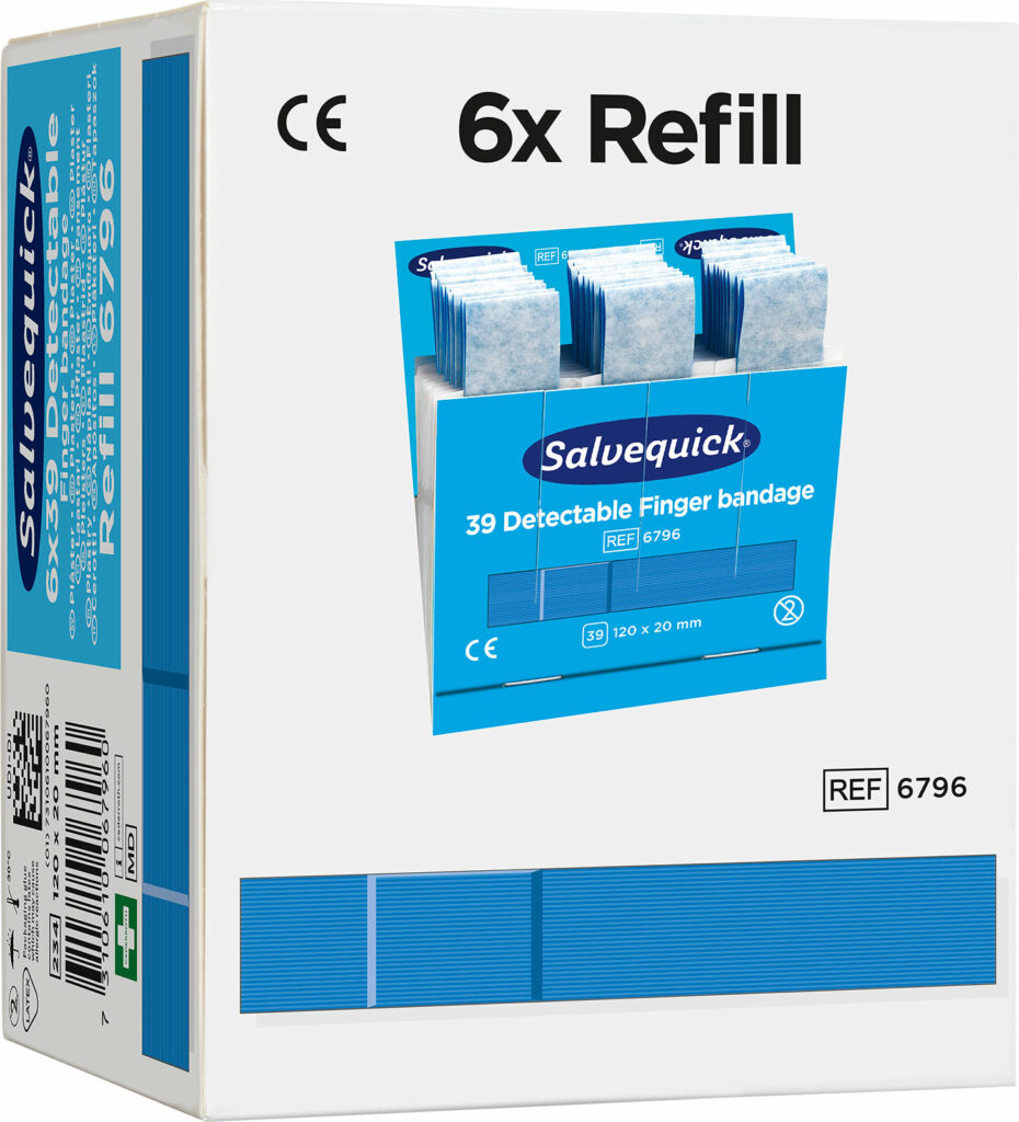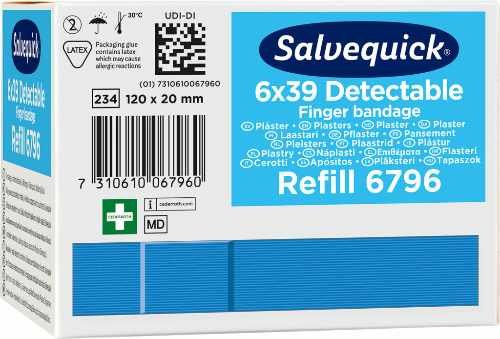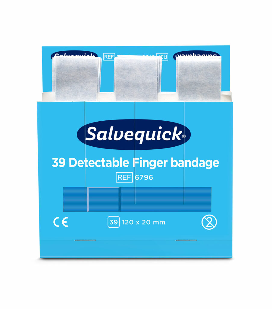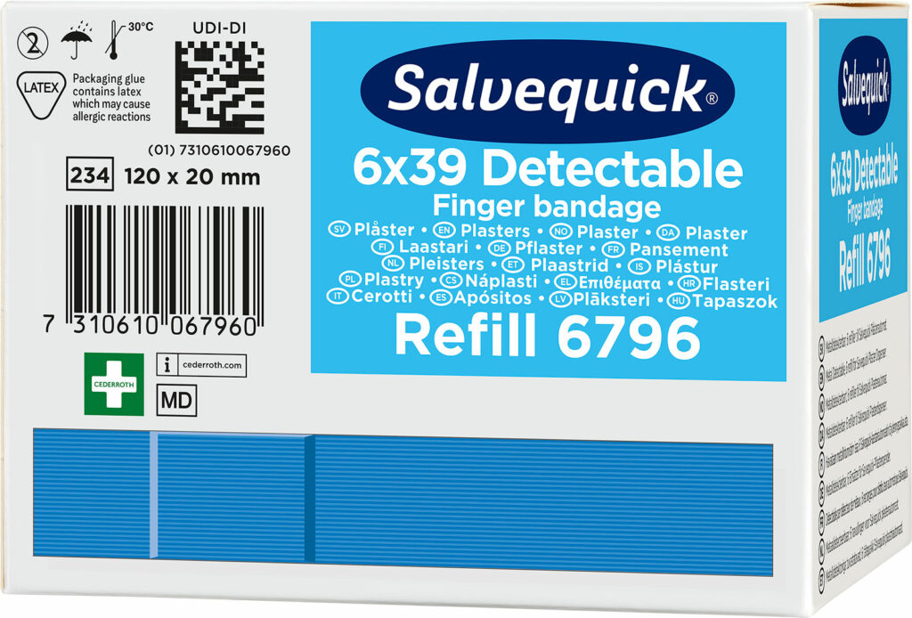 Salvequick Blue Detectable plaster er især beregnet til brug inden for levnedsmiddelindustrien. Plastrene er detekterbare og opdages af de fleste metaldetektorer, som bruges inden for levnedsmiddelindustrien. Den blå farve gør, at plastrene også er lette få øje på. De er lette at sætte på, fleksible og brugervenlige.