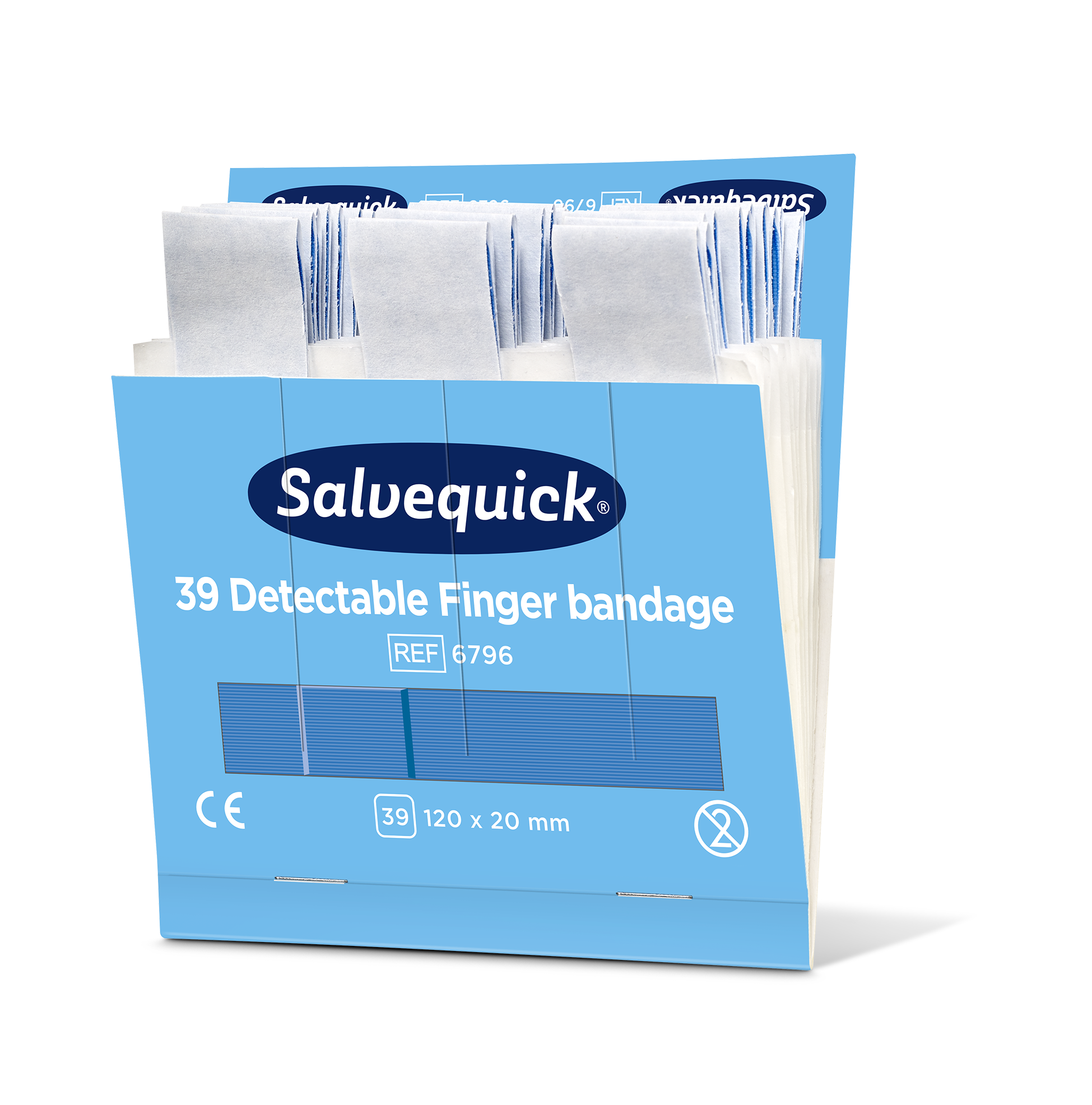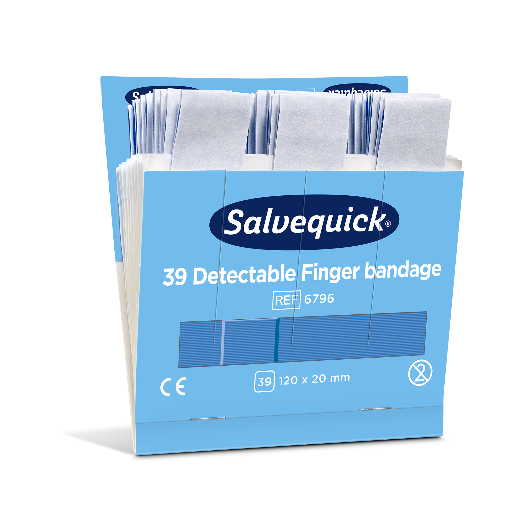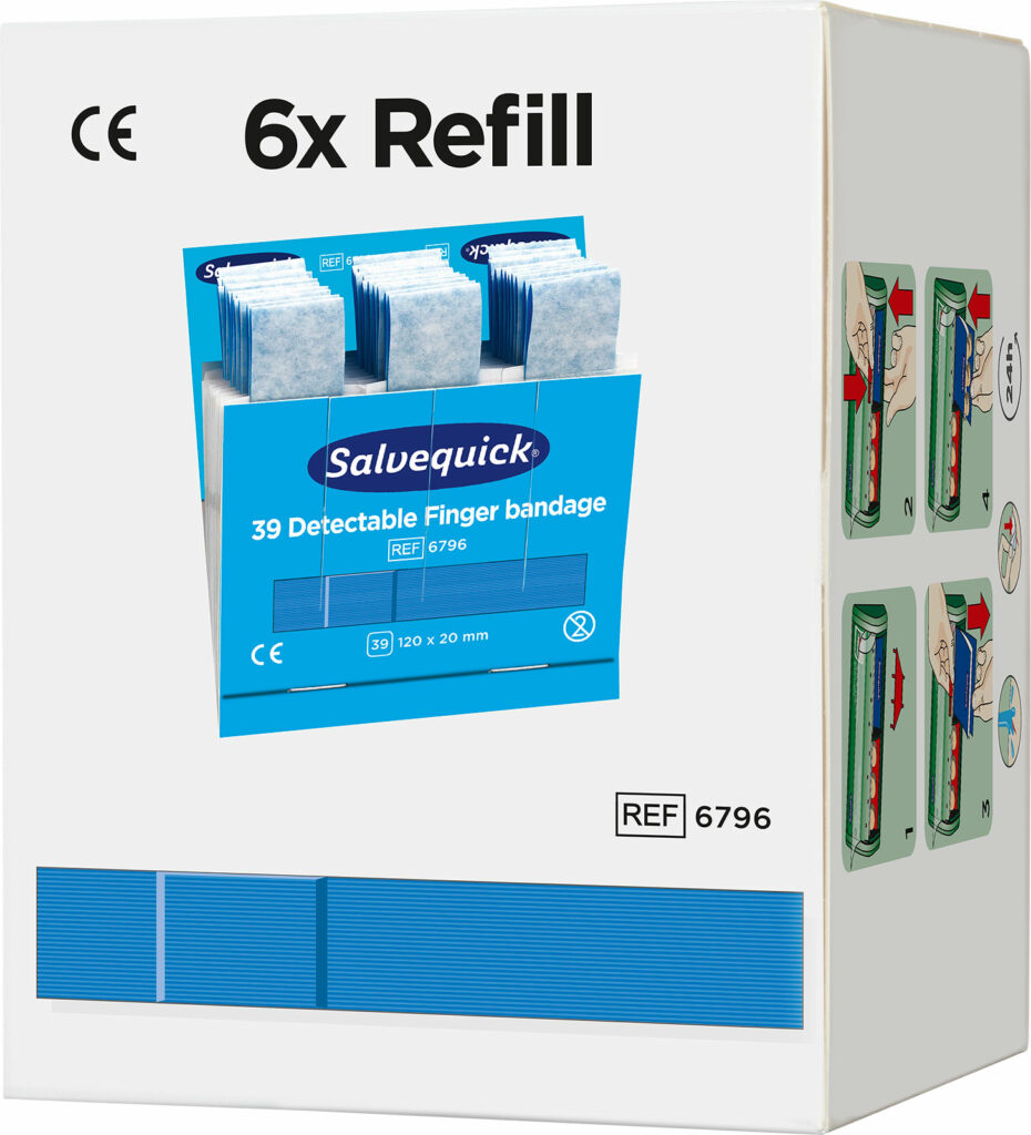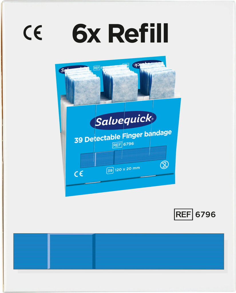 Salvequick Blue Detectable plaster er især beregnet til brug inden for levnedsmiddelindustrien. Plastrene er detekterbare og opdages af de fleste metaldetektorer, som bruges inden for levnedsmiddelindustrien. Den blå farve gør, at plastrene også er lette få øje på. De er lette at sætte på, fleksible og brugervenlige.