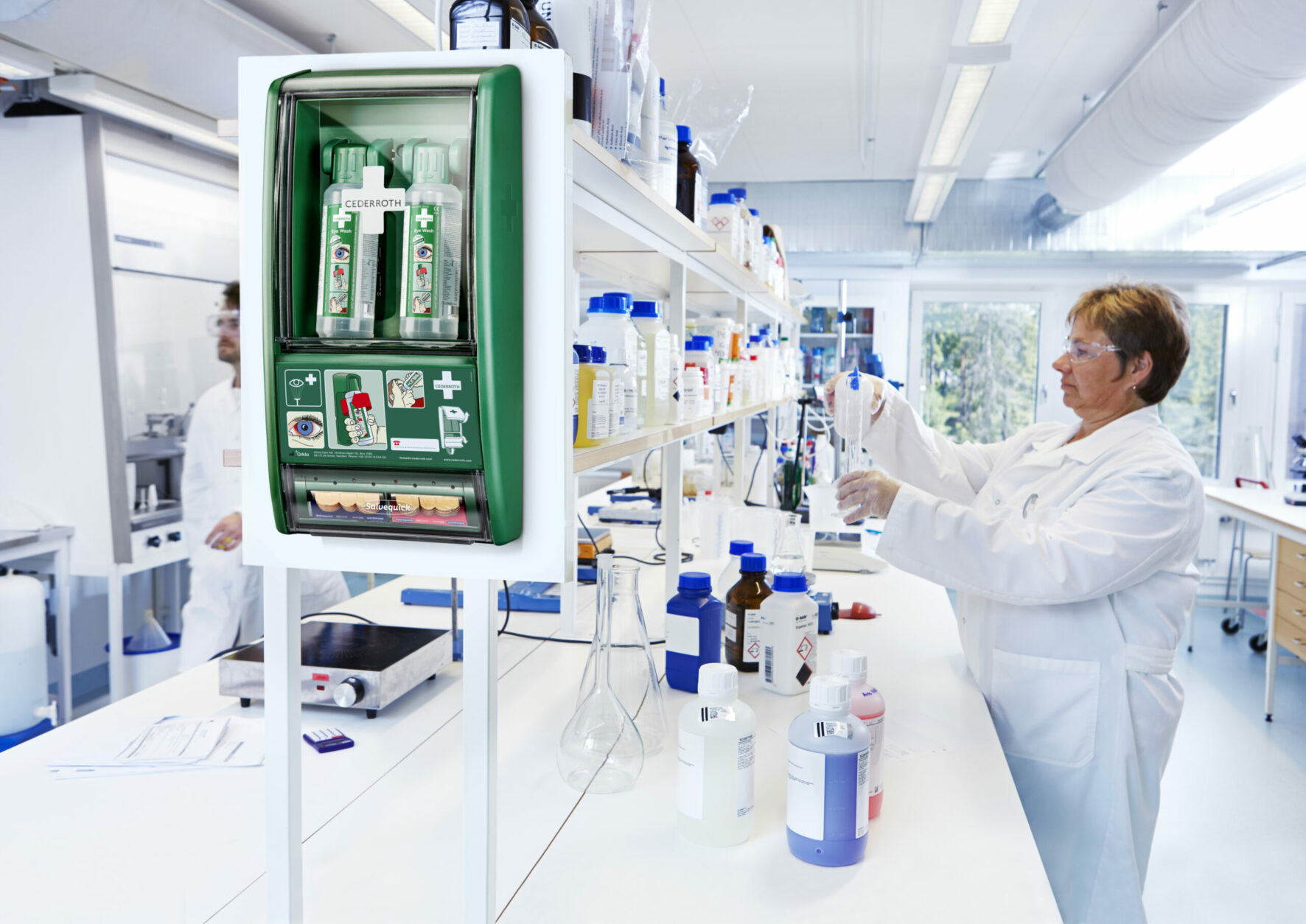 Cederroth silmänhuuhtelutuotteita on saatavissa eri käyttötarkoituksiin ja erilaisilla lisätarvikkeilla, joiden avulla huuhtelupullot voidaan sijoittaa niin, että ne ovat aina helposti saatavilla ja käyttövalmiina.