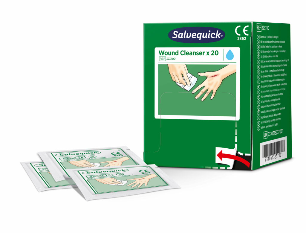 Salvequick Sårvask passer i Cederroth Førstehjelpstasjon. Salvequick Sårvask erstatter bomull og sårvann i flaske. Smidige og lette å bruke. Godt beskyttet i sine forpakninger. Rengjøringsvæsken består av steril fysiologisk koksaltløsning.