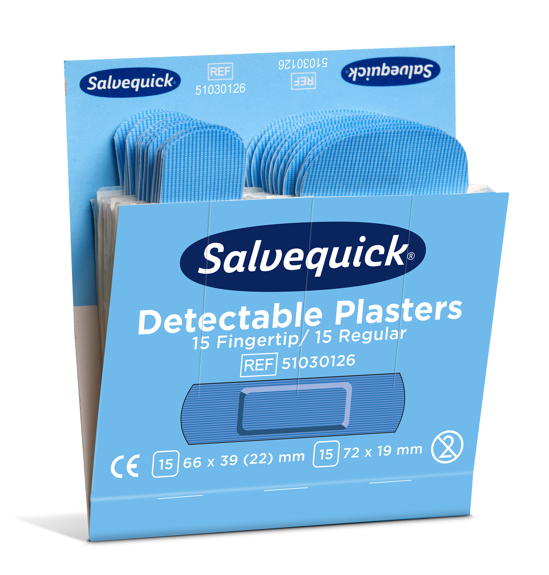 Plaster Salvequick Blue Detectable jest zwłaszcza przeznaczony do użytku w przemyśle spożywczym. Plastry są wykrywalne przez większość wykrywaczy metalu. Dzięki niebieskiemu kolorowi plastry jest łatwo dostrzec. Plastry są poddawane testom na obecność alergenów. Pozwalają na łatwe zakładanie, elastyczne i wygodne w użyciu. Oczyścić ranę, upewnić się, że nie ma zakażenia i zmieniać plaster codziennie