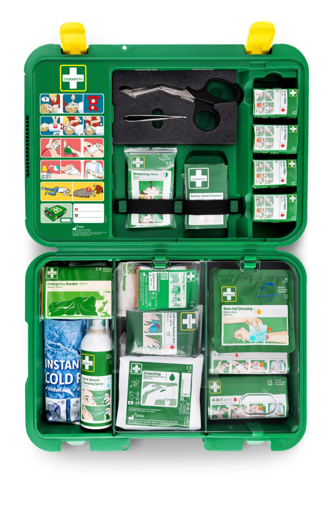 En rejäl och välutrustad Första Hjälpen-väska konstruerad i hårdplast för att hålla damm, fukt och smuts utanför även i hårda miljöer. Plåsterautomaten på utsidan gör det enkelt att ta ett plåster samtidigt som innehållet i väskan hålls orört och hygieniskt rent. I väskan ligger produkterna överskådligt indelade i fack och det är lätt att hitta rätt produkt när varje sekund räknas. I locket finns bland annat handskar, andningsmask, sax och pincett. Alla produkter är försedda med tydliga självförklarande instruktioner. Smarta röda refilldekaler i väskan signalerar när det är dags att fylla på en produkt. Väskan kan även fästas på väggen som ryckväska.